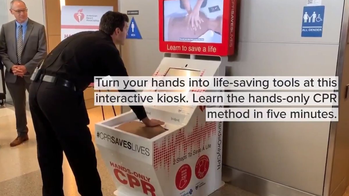 The kiosk -- the result of a partnership between LAWA, the American Heart Association, the Anthem Blue Cross Foundation and the CareMore Foundation -- is located near Gate 150 on the upper/departures level of the Bradley International Terminal. It has a touch screen with a short video that provides an overview of hands-only CPR, followed by a practice session and a 30-second test.