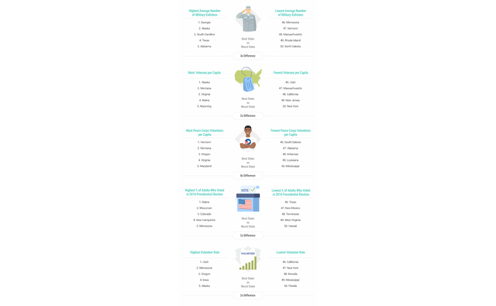 To find out, WalletHub compared all 50 states across 13 key indicators of patriotism, including: the number of people who enlist in the military, the number of veterans per capita, as well as the number of adults who voted in the last presidential election and the number of volunteers per capita.