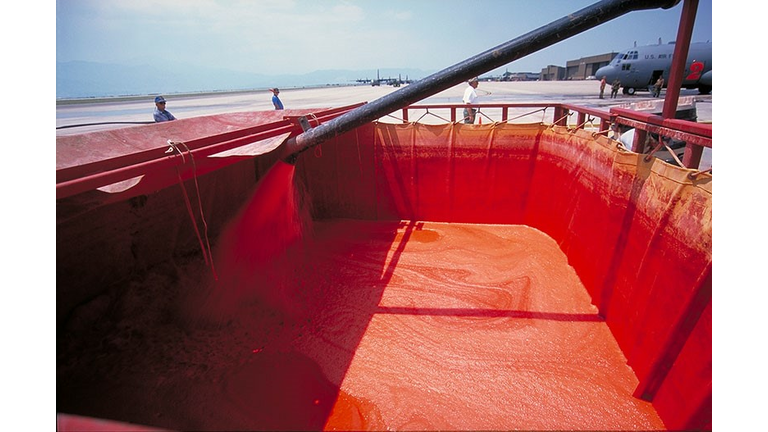 The product is manufactured at the company’s main plant in Rancho Cucamonga and because of a robust raw product supply chain employees can make the retardant concentrate pretty quickly. Goldberg says the product is shipped in concentrate form and diluted at the designated airbase before loaded onto an aircraft.