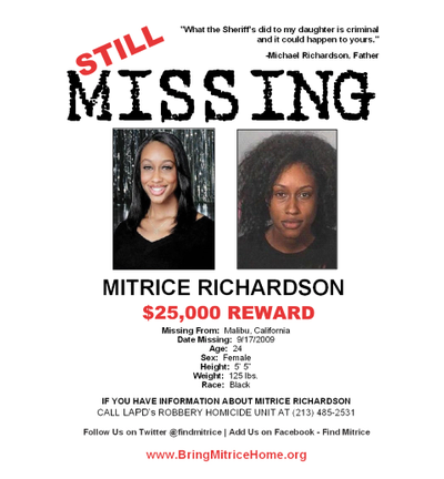LOS ANGELES (CNS) - The Los Angeles County Board of Supervisors today will consider increasing and extending a reward offered for information leading to a conviction in the death of Mitrice Richardson, a woman who went missing after being released from the sheriff's Malibu-Lost Hills Station in 2009.