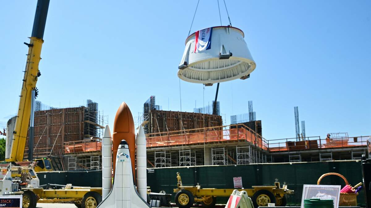 That move will require the use of a 450-foot-tall crane, which will lift the orbiter over the under-construction walls of the Samuel Oschin center, then lower it next to the boosters and fuel tank to complete the "Go For Stack" process of assembling the vertical display.