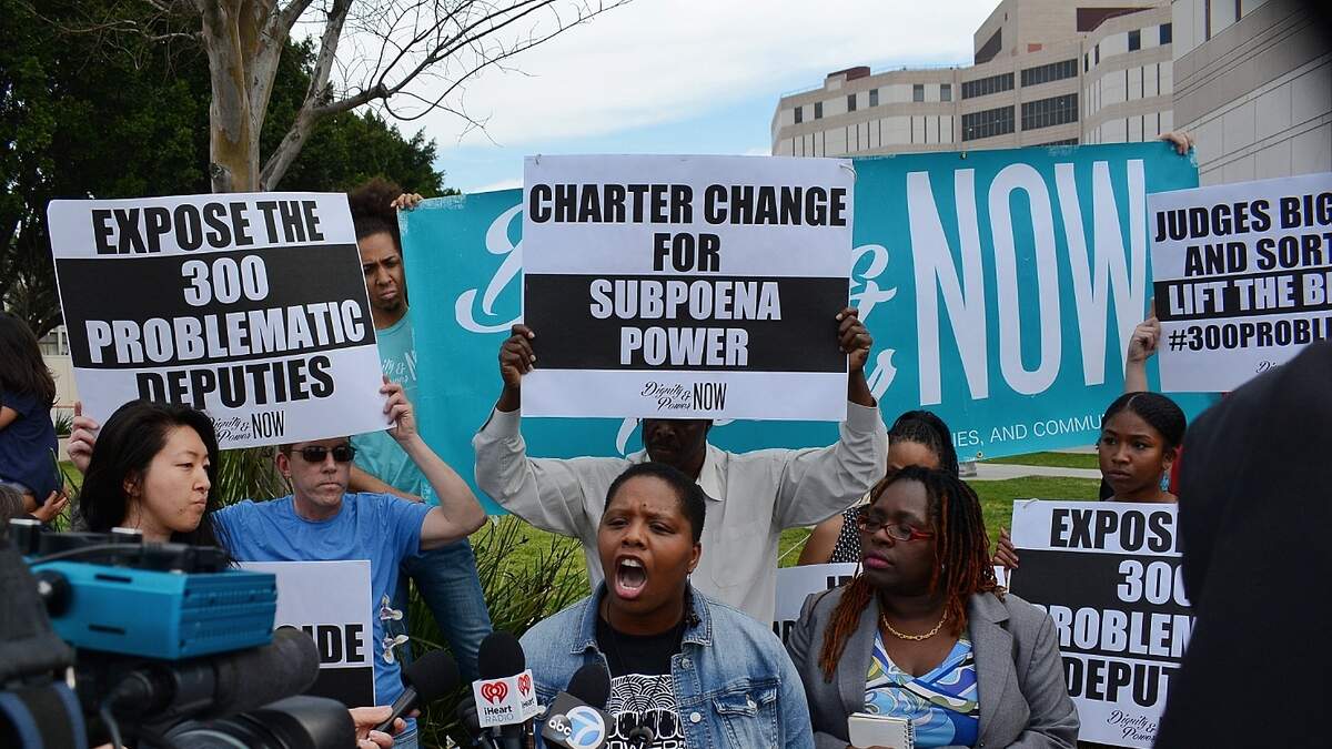 The demonstrators called on the County Board of Supervisors to move to give the Sheriff's Department's Inspector General's office full legal authority to investigate allegations of law enforcement misconduct -- of which records are usually off-limits under California's unique secrecy laws for police.