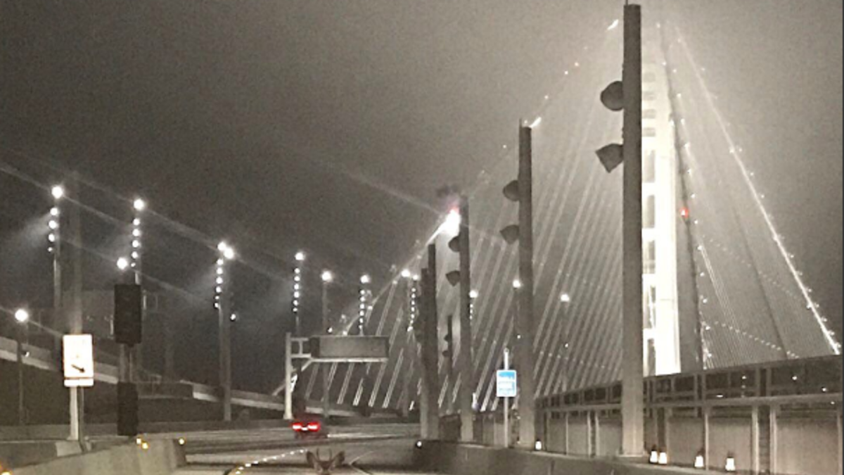 CHP Officer Matthew Hamer says two officers were on patrol on the bridge early Tuesday when the deer came out of the woods on Treasure Island and walked in front of their car.