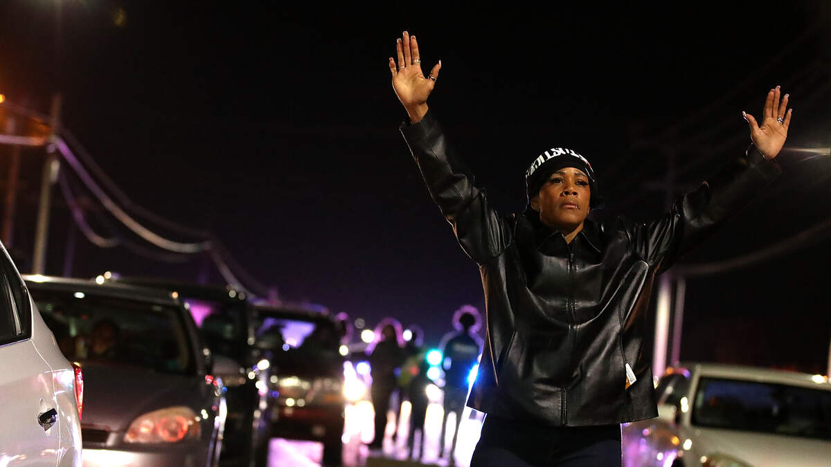 About 200 protesters confronted drivers in traffic, breaking the rear window of one car as it made its way through the throng.