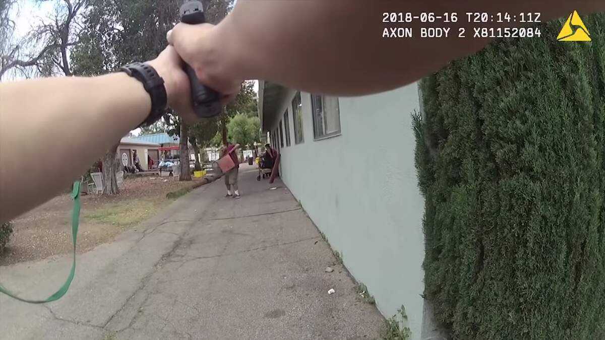 Perez can be seen using a metal folding chair to deflect two shots fired by an officer holding a beanbag shotgun. The suspect then moves to take a woman hostage, holding the knife he had to her neck.