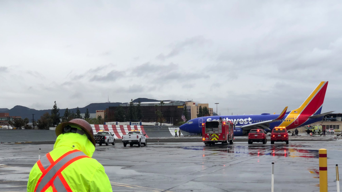 A Southwest airplane accidentally rolled off the end of a runway at Hollywood Burbank airport Thursday morning as it was landing in heavy rain, the Federal Aviation Administration said.