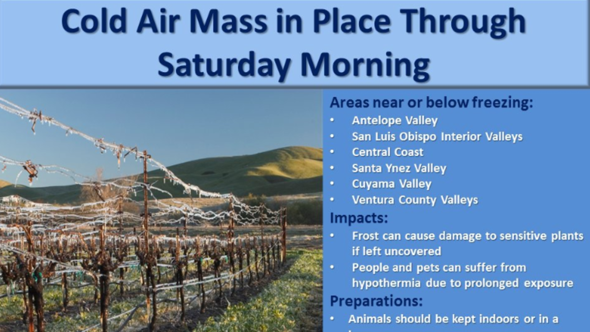LOS ANGELES (CNS) - A cold air mass will move into the Antelope Valley and drop temperatures into the mid-teens and lower 20s, beginning tonight and into Saturday morning.