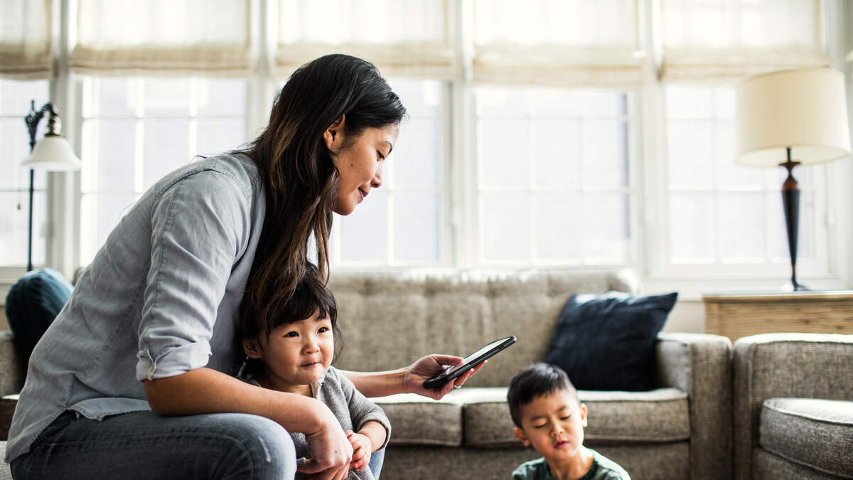 Mother using smartphone with children present