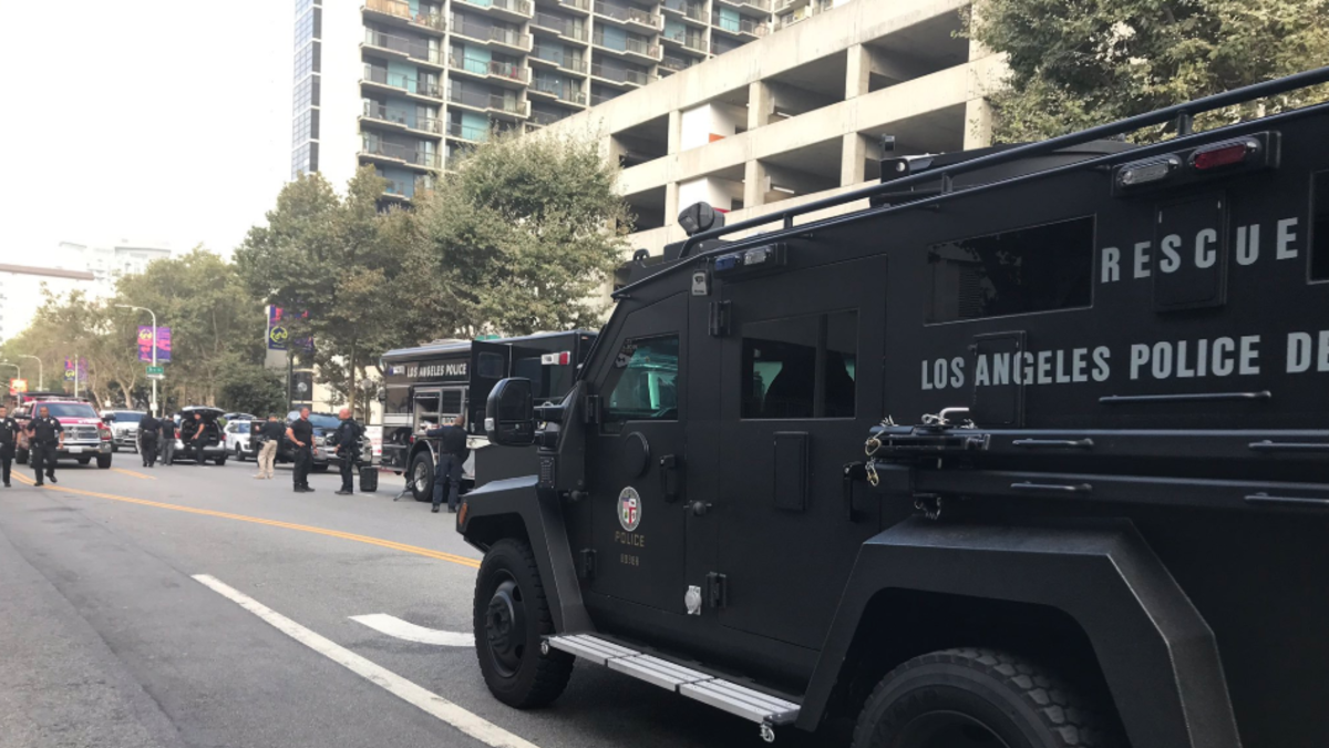 The car was located by Los Angeles Police Department officers around 3 a.m. near Hill and Second Streets. Video from the scene showed officers with guns drawn taking positions behind the car and the SWAT vehicle next to the Prius.