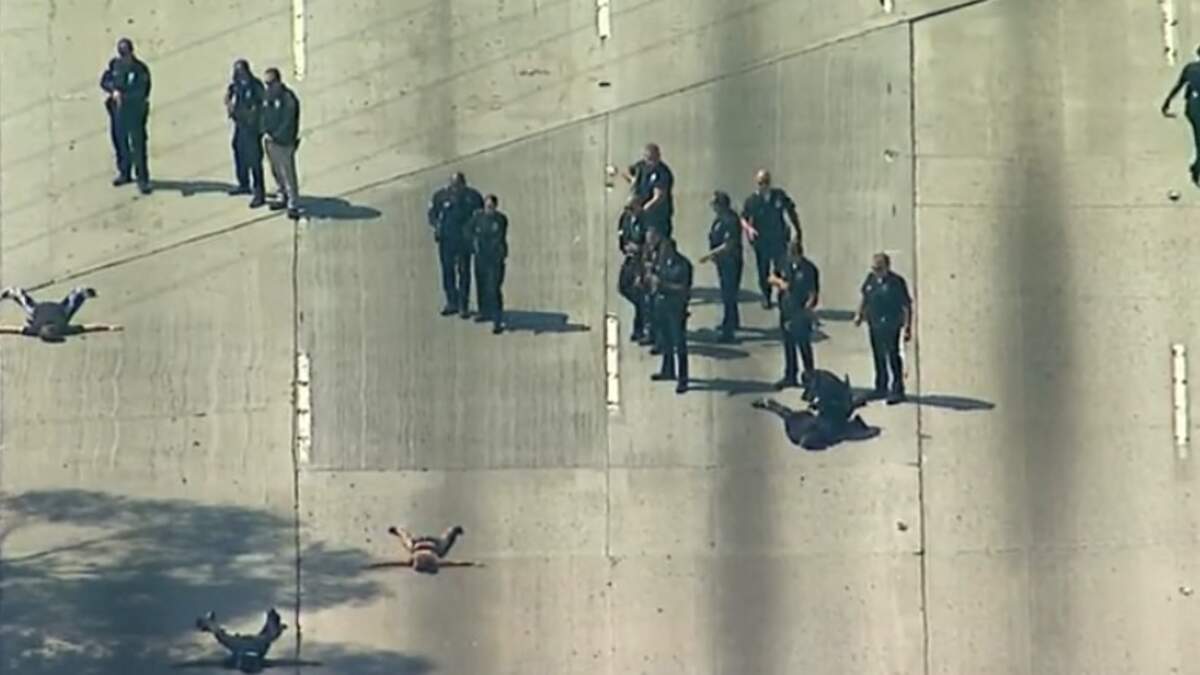 Officers caught up with the suspects on the freeway and stopped the white SUV in which they fled. Southbound traffic was halted between Howard Hughes Parkway and La Tijera Boulevard and the seven suspects were ordered out of the vehicle and made to get face down in freeway lanes, their arms and legs splayed to their sides before being taken into custody,