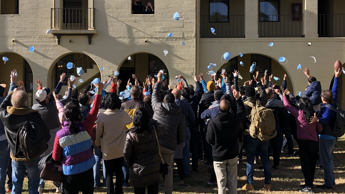 RIVERSIDE (CNS) - With high-fives, hugs and a celebratory tossing of protective face masks into the air, a quarantine of nearly 200 people who were evacuated from the Chinese epicenter of the deadly coronavirus and housed for two weeks at March Air Reserve Base came to an end today.