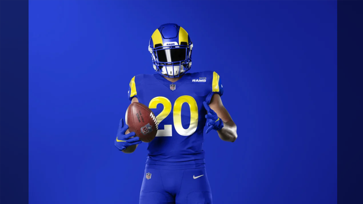 The team collaborated with Nike Global Identity Group and the National Football League. The color uniform includes a monochromatic look of a vibrant, royal blue, as well as a set featuring the royal jersey paired with a yellow pant. The lighter uniform introduces a first-of-its-kind color called Bone, which reflects the color of an actual Rams horn and the beaches of Los Angeles, the Rams said.