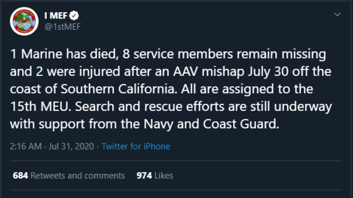 “We are deeply saddened by this tragic incident,'' Colonel Christopher Bronzi, 15th MEU Commanding Officer, tweeted early Friday. “I ask that you keep our Marines, Sailors, and their families in your prayers as we continue our search."