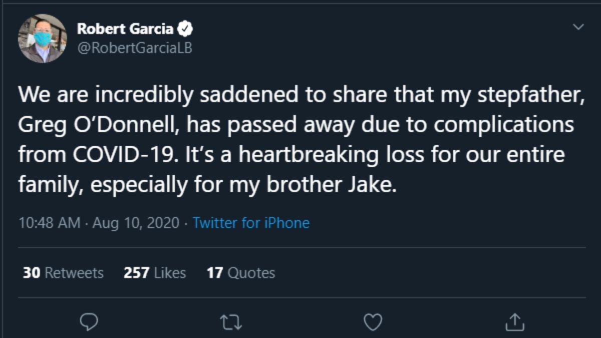 LONG BEACH (CNS) - Long Beach Mayor Robert Garcia announced today that his stepfather died due to complications from COVID-19, one day after the family held a memorial service for the mayor's mother.
