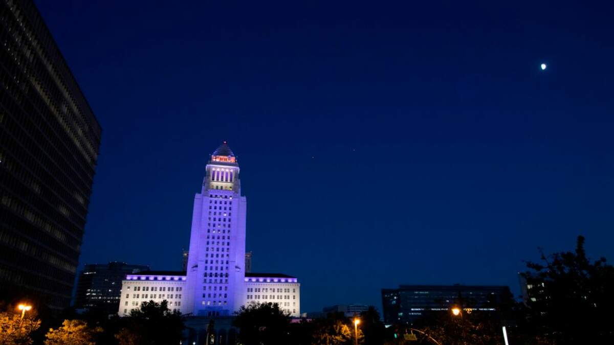 Los Angeles police officers, some in riot gear, stood watch behind metal barriers outside police headquarters.