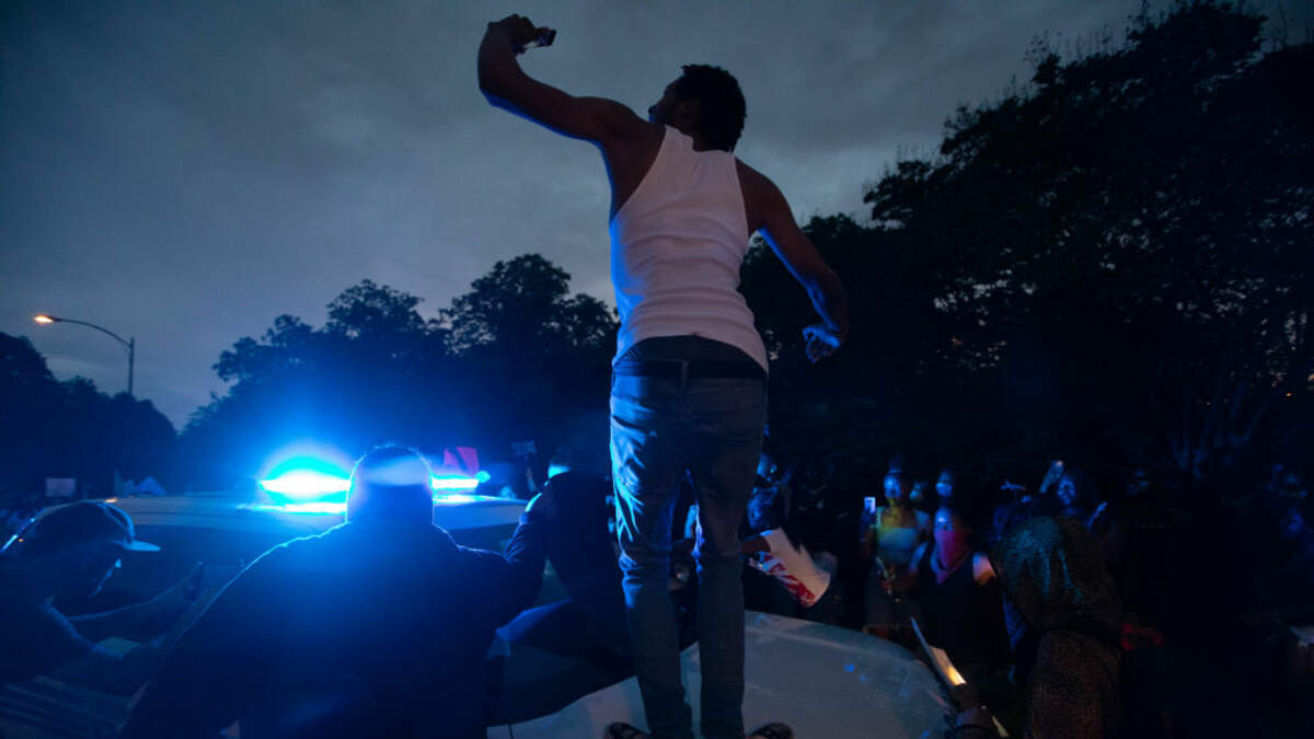 Several protesters surrounded a cruiser and began hitting the vehicle and blocked it from driving away. The officers were eventually able to back out of the area.
