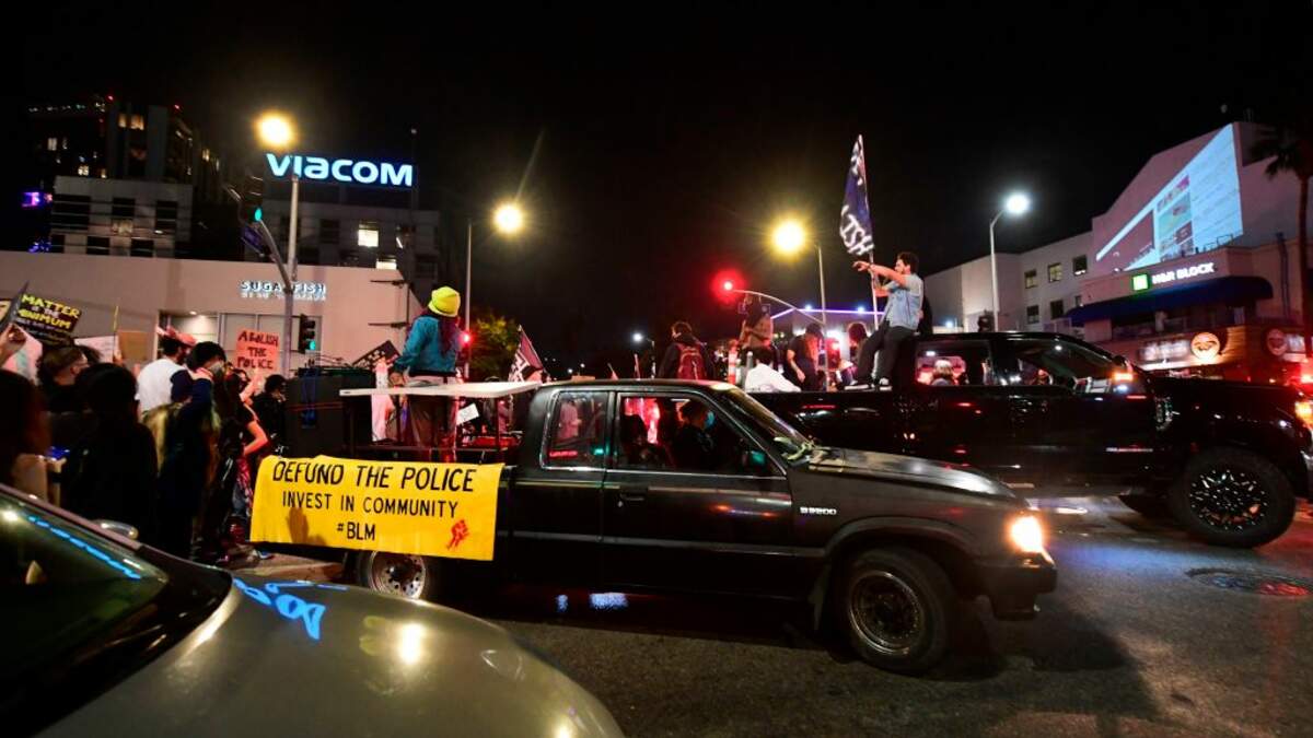 The Thursday evening protests began around 7:30 p.m., with at least 200 people sitting and standing in the grass outside the entrance to the Hollywood Forever Cemetery at 6000 Santa Monica Blvd. in Hollywood. The mostly peaceful demonstration wound its way up to Sunset Boulevard.
