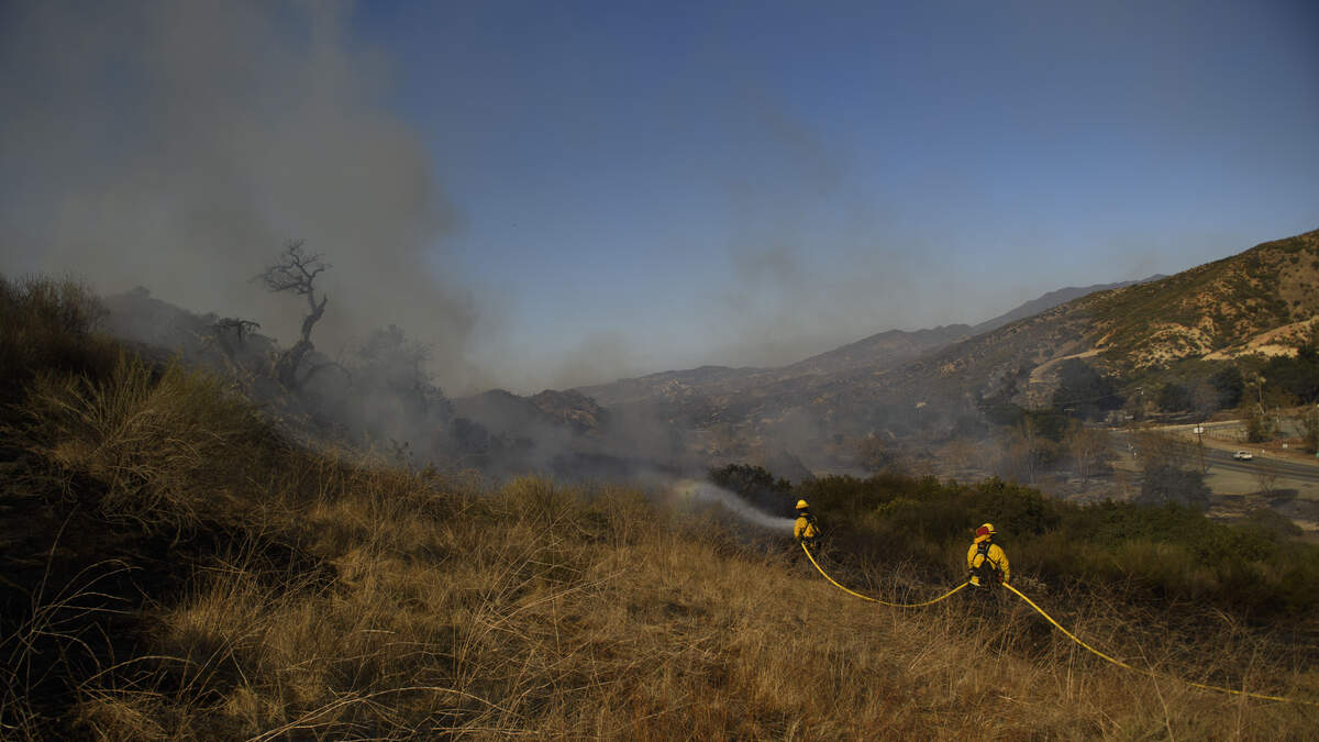 Firefighters expected Santa Ana winds to peak Tuesday morning, with continuing dry conditions and low humidity, prompting the National Weather Service to issue a red-flag warning that will remain in effect through Tuesday night.