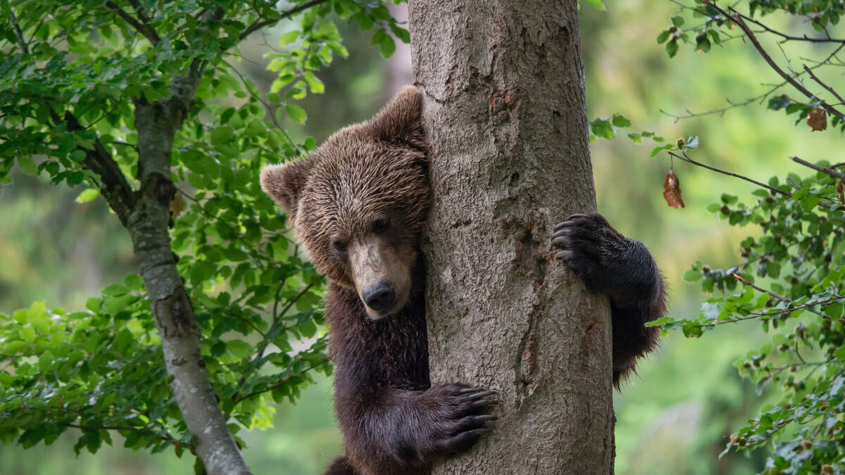 The video shows a black bear with its paws on a table, knocking down a center piece, then turning to face guests seated at another table.