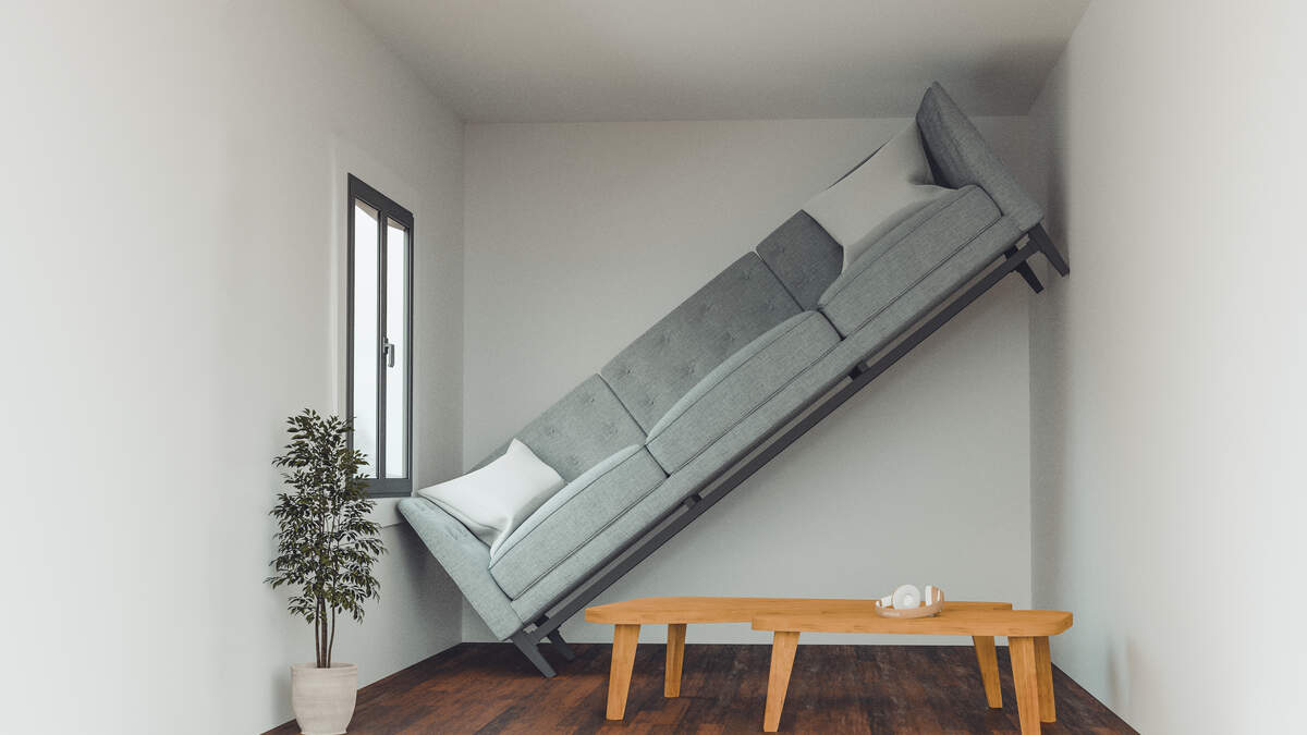 Concept of an apartment or living room that is too small to fit a sofa
